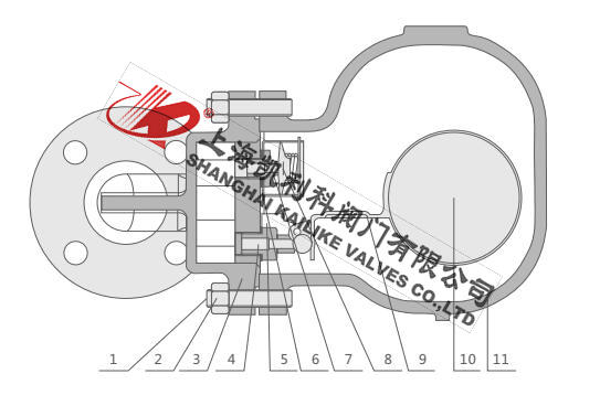 该阀刚启动时,自动排空气装置迅速排除系统中不凝结气体,当蒸汽和热凝结水进入后,阀腔内温度随着升高,排空气装置自动关闭,浮球根据凝结水水位的变化而作升降,带动杠杆调节阀座孔的开度,连续排放凝结水。当凝结水停止进入时,浮球靠自重下降,驱使杠杆带动阀芯关闭排水阀座孔。