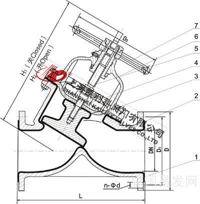 4、阀体与盖被中间隔膜隔开,使得隔膜上方的阀盖,阀杆零件不受介质侵蚀;
