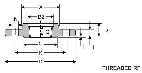 (5) The minimum length of effective thread in reducing flanges is at least equal to dimension Q of the corresponding class of threaded flange as shown in the above tables. Threads do not necessarily extend to the face to the flange.